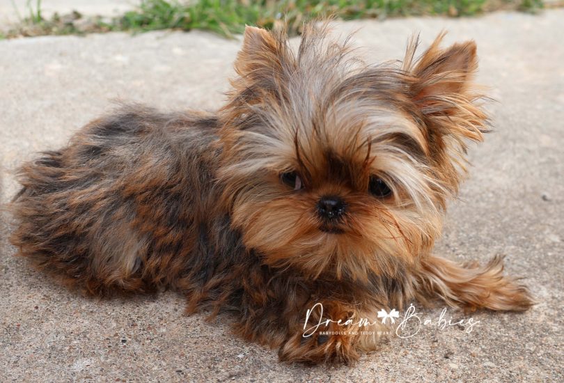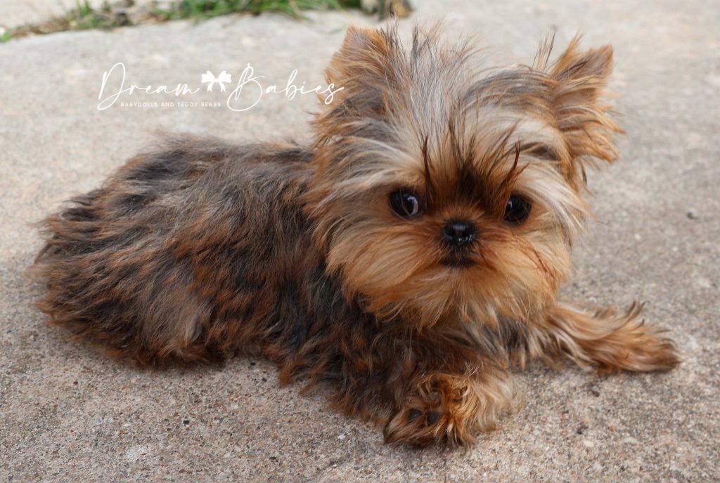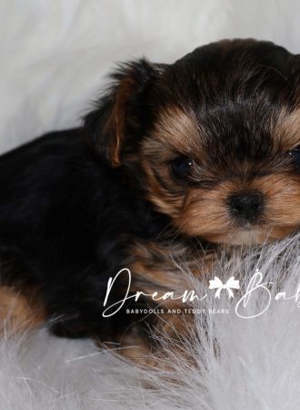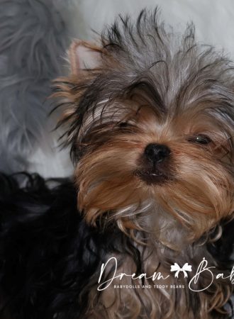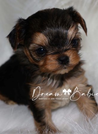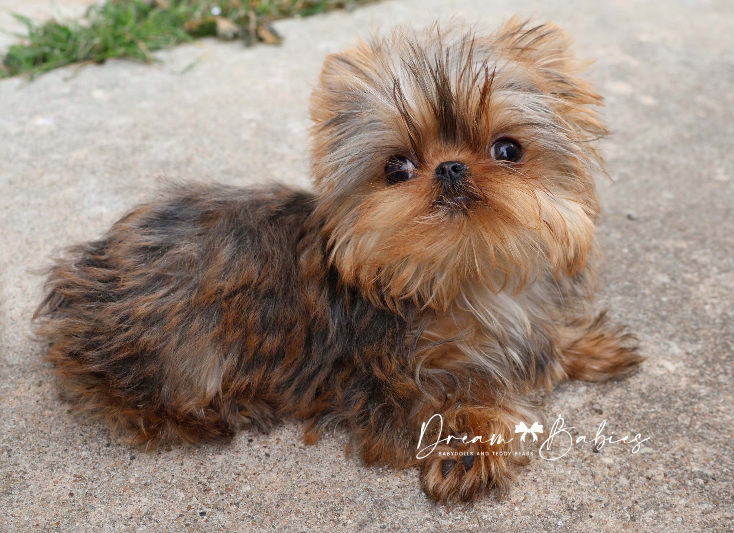 Hershey is a gorgeous extremely doll face boy. He has a super short, scrunched up snout (literally, looks like he has no snout), very wide set eyes, tiny ears, apple head, short/compact body frame, and and he'll have a thick silky coat. He is the perfect package!! He will make a great little lap baby for someone! Probably the most extreme Yorkie you can find in the USA that is purebred and not imported. 😊